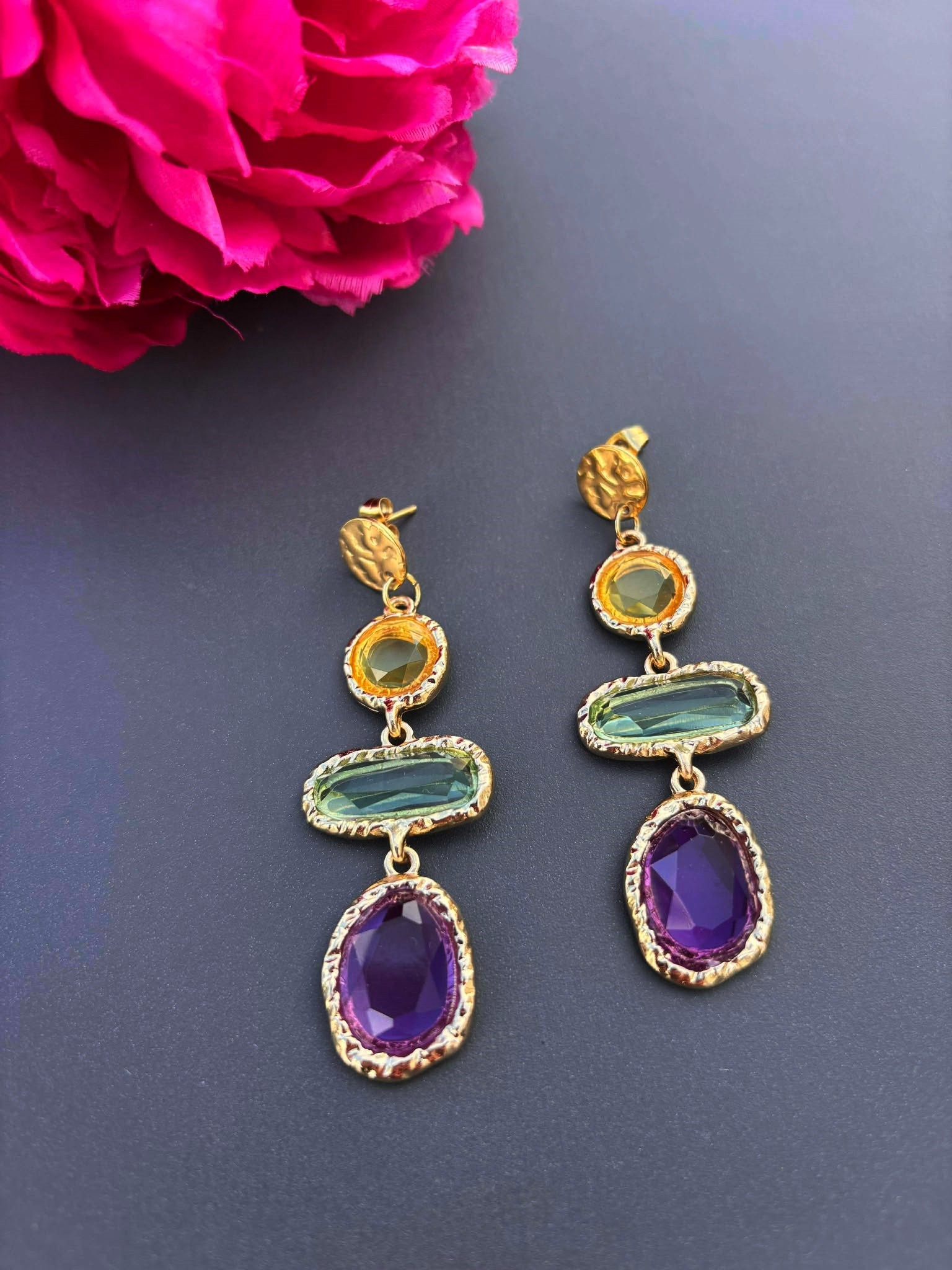 Elles se composent de pierres de teintes colorées, sublimées par un serti doré à l'aspect texturé, au charme bohème et méditerranéen.