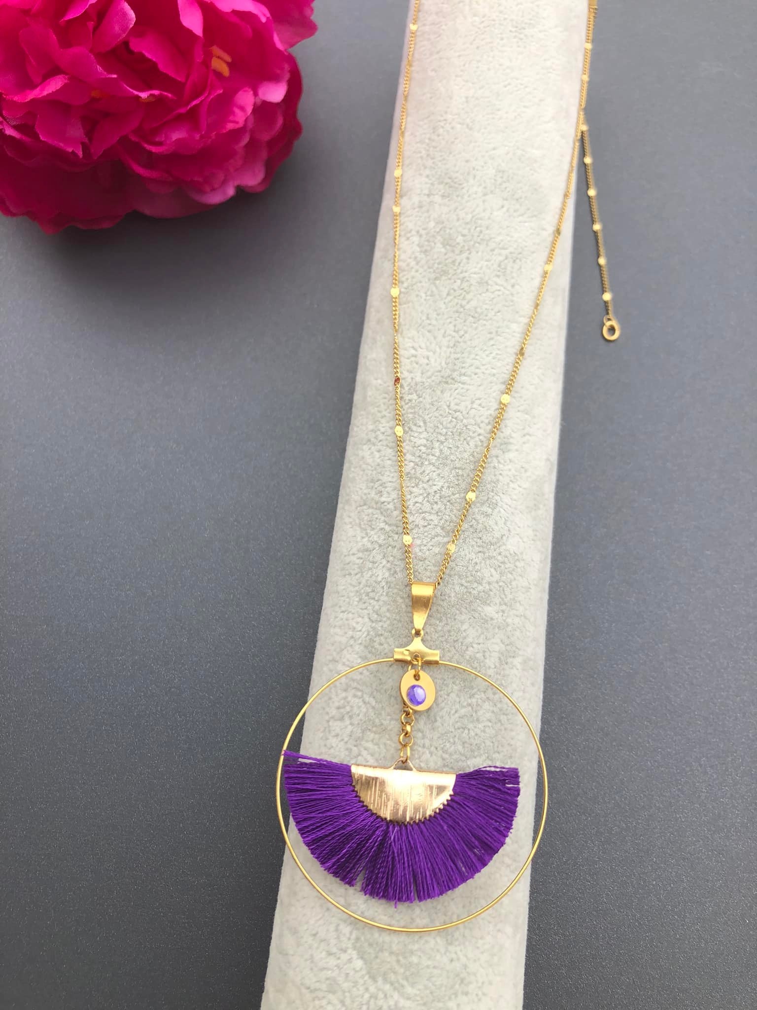 Son grand anneau doré apporte une vraie présence, tandis que son pendentif en demi-lune violet donne une touche chic et audacieuse, tout en restant très féminin !