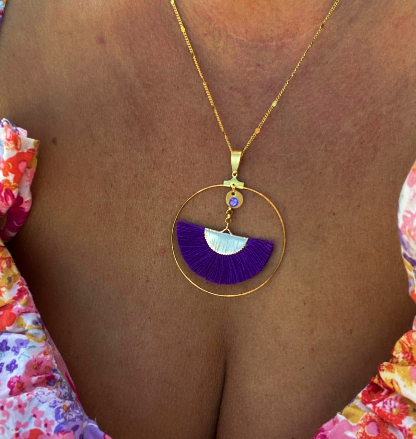 Le collier LUNA se porte aussi bien avec une robe fleurie qu'avec un haut uni blanc, beige ou noir, pour faire ressortir ses couleurs !
