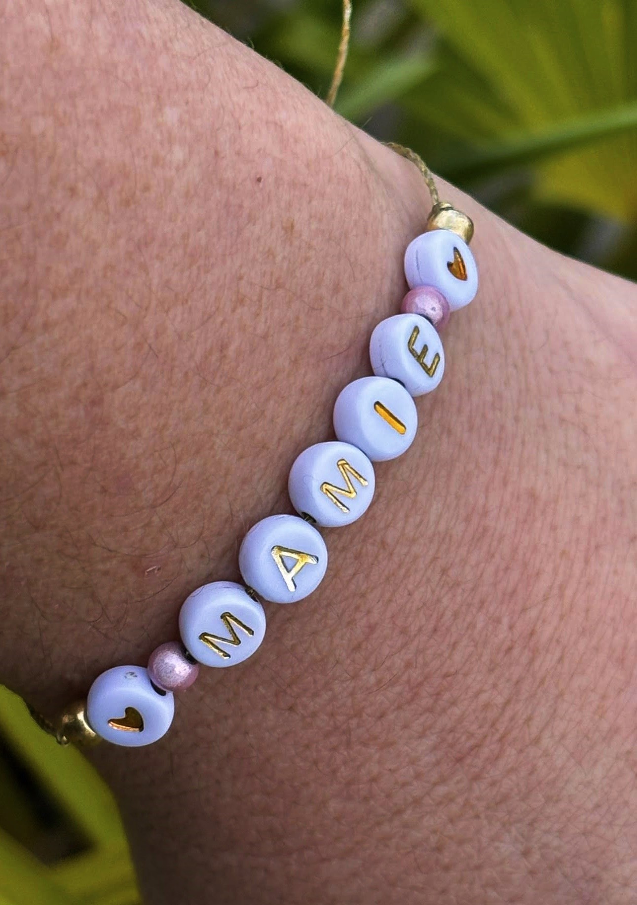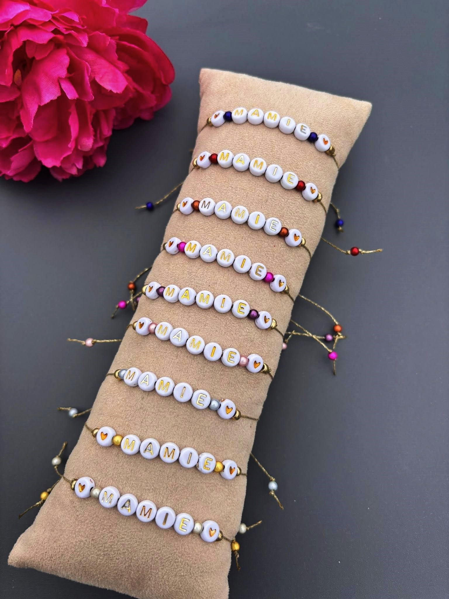 Monté sur un cordon ciré doré lumineux, ce bracelet est composé de perles blanches aux lettres dorées formant le mot " mamie ", délicatement encadrées de petits coeurs et de perles colorées !