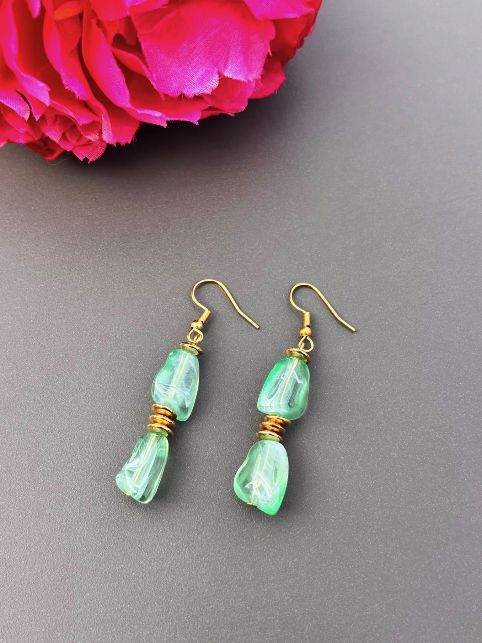 Elégantes et lumineuses, elles apportent une touche de fraicheur et mettera en valeur subtilement votre visage avec ses perles aux nuances vert d'eau marbrées !